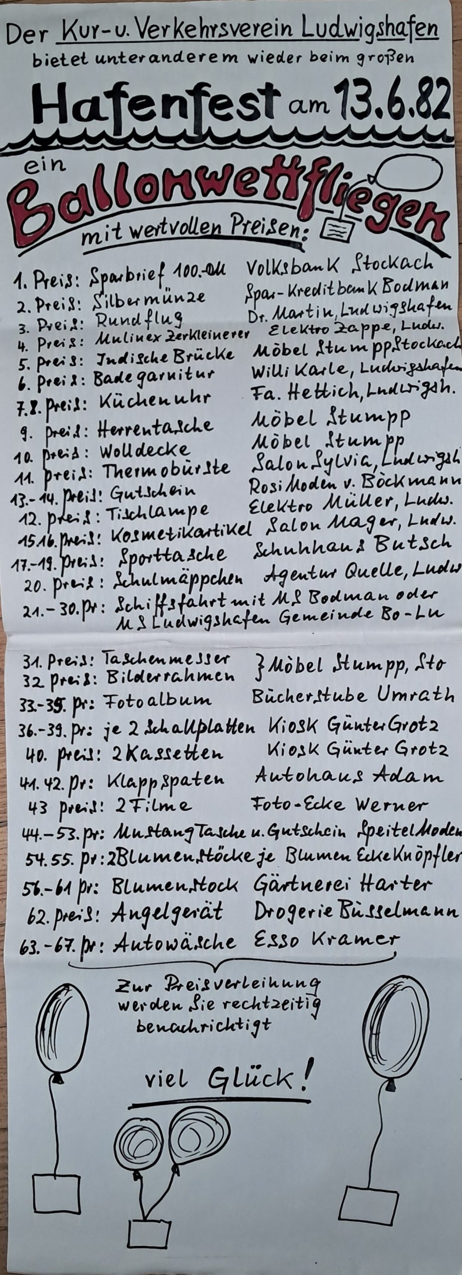 „Herzlich Willkommen! Diesen Sontag feiern wir in Ludwigshafen unser erstes Heimatfest, dem wir den Namen „Hafenfest“ gegeben haben. Das Hafenfest soll zu einem festen Bestandteil der Veranstaltungen in unserer Gemeinde werden und soll die Einwohner von Bodman-Ludwigshafen und die unserer Nachbargemeinden, die sich mit uns verbunden fühlen, einmal im Jahr zu einem freudigen und fröhlichen Tag zusammenführen. Dieses Fest ist ein aktiver Beitrag zur Stärkung des Zusammengehörigkeitsgefühl und zum Zusammenwachsen unserer Raumschaft sein. Ich lade Sie daher alle recht herzlich ein, bei unserem Hafenfest mitzufeiern und heiße Sie als unsere Gäste in Ludwigshafen auf das herzlichste Willkommen“. Das waren die Begrüßungsworte vom damaligen Bürgermeister, Werner Debis.