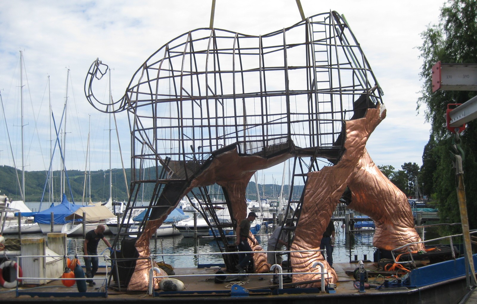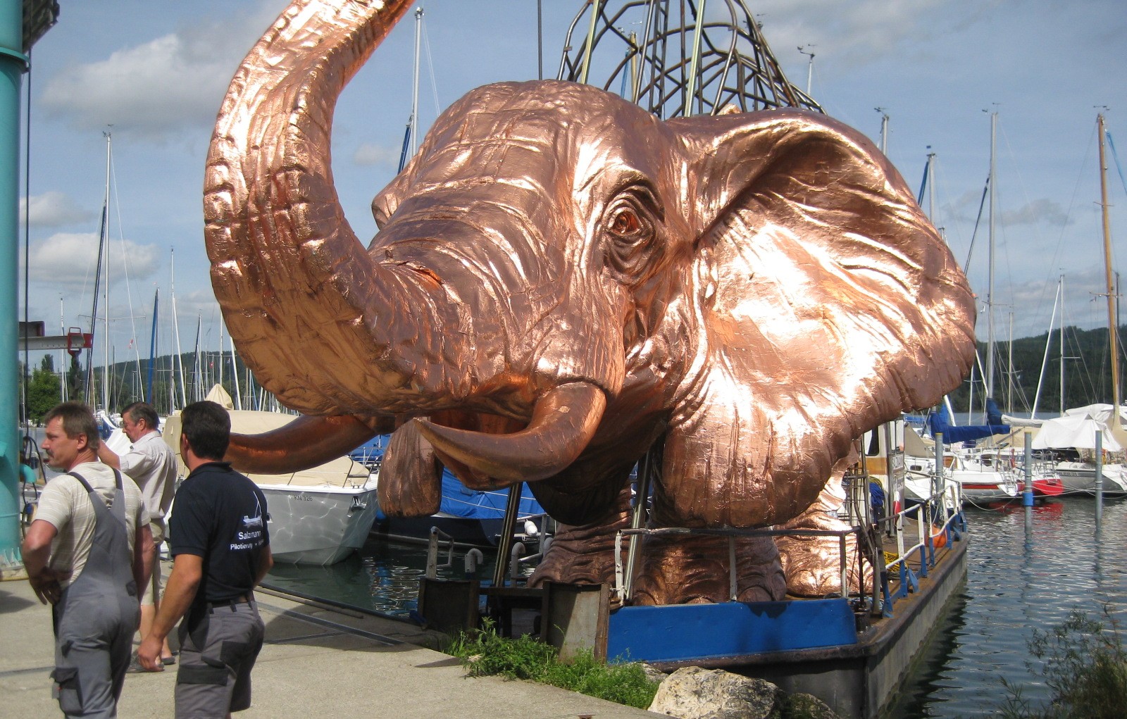 Gemäß dem Motto „Eine Seefahrt, die ist lustig“, wurde eine Überfahrt des Elefanten von Bregenz nach Bodman organisiert. Am 25. August 2010, machte das Schiff die Leinen los, mit Kurs auf unser SeeEnde. So begab sich der Koloss mit seinen beachtlichen 2,5 Tonnen Gewicht auf eine mehrstündige, 64 km lange Reise. Aus der Ferne betrachtet entstand der Eindruck, dass der Elefant mit seiner rotgoldenen Farbe leichtfüßig über das Wasser schreitet. Dies nicht wegen seiner biblischen Standfestigkeit, sondern wegen der Plattform des Rammschiffs, die aus der Ferne kaum auszumachen war. Bei gutem Wetter und kaum Seegang landete der Elefant ohne Probleme an den gräflichen Steganlagen in Bodman. Da der Koloss in einem Stück nicht auf der Straße transportiert werden konnte, wurde der Kopf vom Rumpf getrennt. Auf einem firmeneigenen LKW trat der Kopf die kurze Fahrt zum Firmengelände Rettich an.