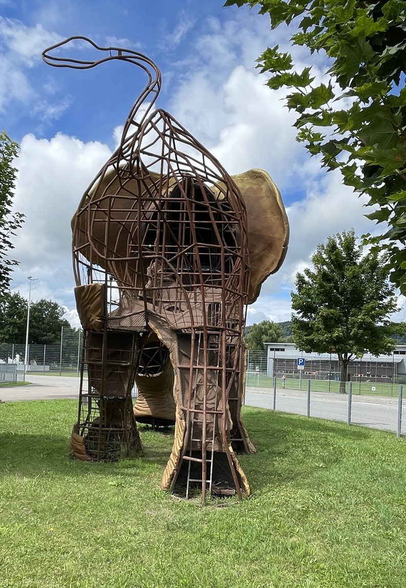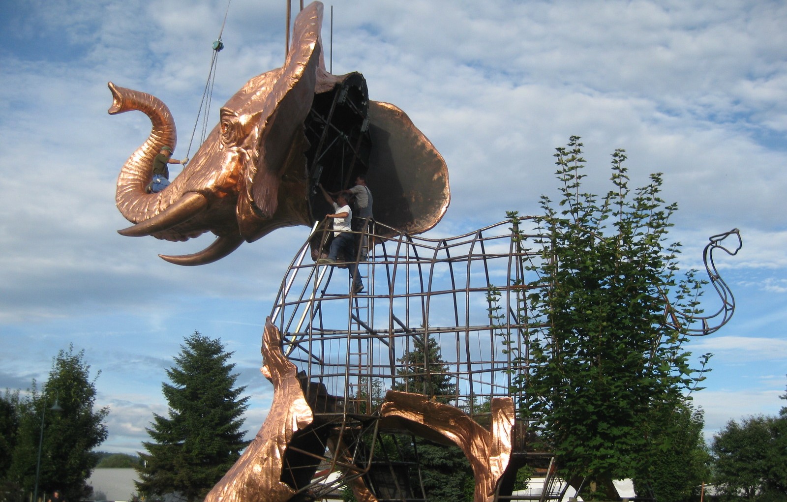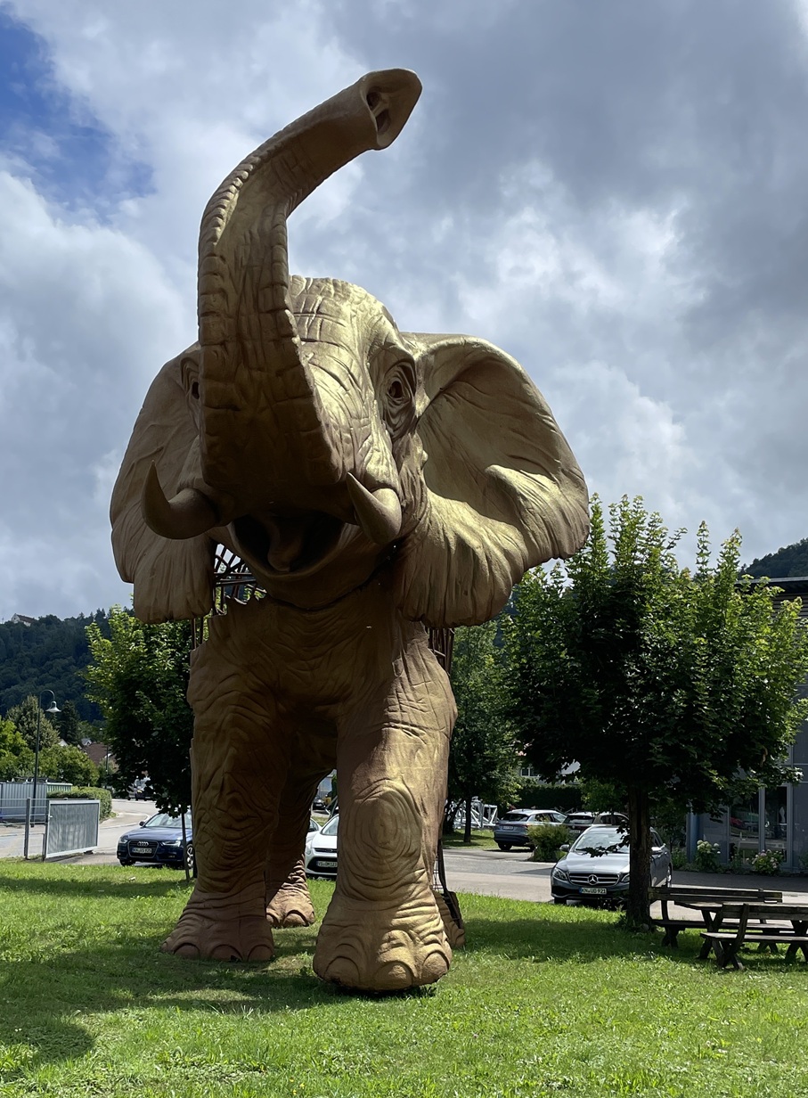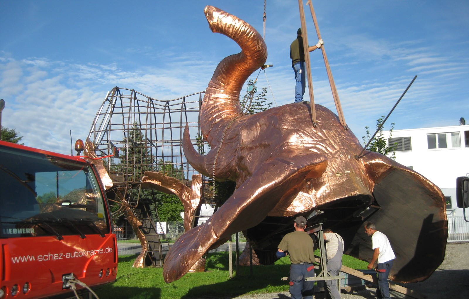 Am Standort schließlich angekommen wurden Kopf und Körper wieder zusammengefügt. Nun stand er, unter ungläubigem Staunen der Nachbarschaft, im Vorgarten wie bestellt und nicht abgeholt, was sich bald darauf bewahrheiten sollte, denn der Verkauf hatte sich zwischenzeitlich zerschlagen. Nach Rücksprache mit Bregenz kam die Nachricht zurück – wollt ihr den vielleicht haben? Gesagt, getan, die Fa. Rettich erwarb den Elefanten und kümmert sich seither um den Erhalt.