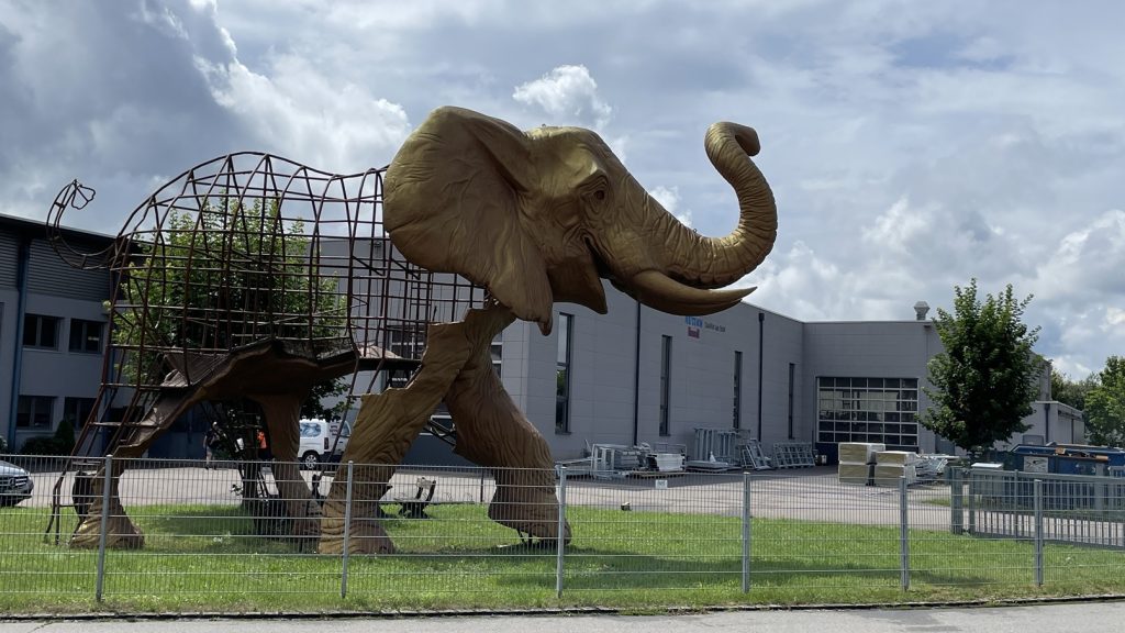 Und hier beginnt die spannende Reise unseres Elefanten, zu der uns Simone Rettich-Bickel alle Einzelheiten erzählen konnte. Der Rammschiff-Besitzer Salzmann, der den Elefanten während der Festspiele über das Wasser steuerte, hat geschäftliche Beziehungen zur Fa. Rettich in Bodman. Dieser schlug vor, man könnte doch den Elefanten vorübergehend in den großen Hallen dort parken. Einziges Probleme – in den Hallen wird produziert und ein Elefant in dieser Größenordnung ein Störenfried. So wurde vereinbart, dass der Riese nicht in der Halle, sondern vorübergehend im Vorgarten platziert werden soll.