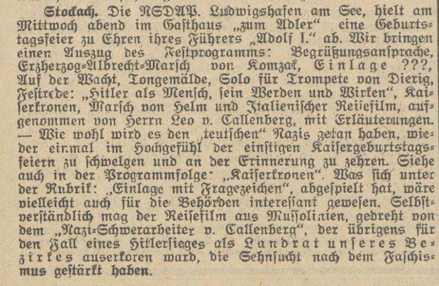 Als Parteigenosse versuchte Leo von Callenberg sich in der Zeit des Nationalsozialismus Vorteile zu verschaffen. Bei einer Feier der NSDAP zu Ehren des Führers im Gasthaus „Zum Adler“ tat er sich 1932 mit einem Film über seine Reiseerlebnisse in Italien hervor. Der Kommentator merkte dazu an: „Der Reisefilm aus Mussolinien, gedreht von dem ‘Nazi-Schwerabeiter‘ v. Callenberg, der übrigens für den Fall eines Hitlersieges als Landrat unseres Bezirkes auserkoren war, mag die Sehnsucht nach dem Faschismus gestärkt haben.“ Doch auch die Parteiliebe war nur von kurzer Dauer. In derselben Zeitschrift ist sechs Monate später bereits zu lesen, dass von Callenberg das „vergötterte Hakenkreuz“ verlassen hätte und „jetzt in Stahlhelm mache“.