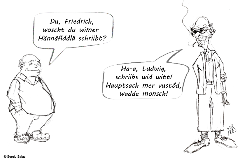 Mundart sprechen heißt: schwätzë wi ôm s’Muul gwaasë isch. Bis hierher ist alles noch ganz einfach. Aber bei der Frage wie man Mundart schreibt, wird es dann kompliziert. Mundart wird nämlich hauptsächlich g’schwätzt und nu ganz sëltë g’schribbë. Und well mër ibëraal anderscht schwätzt, kann es für Mundart keine Rechtschreibung geben, oder es müssten tausende sein. Selbst das, was wir Alemannisch nennen, wird nicht überall gleich gesprochen. Schon im nächsten Dorf gibt es Sprachvarianten davon. Und auf dem Weg vom Bodensee ins Markgräflerland, von Konstanz nach Karlsruhe hat sich das Alemannische schon merklich verändert. Um sich also auf eine Rechtschreibung festzulegen, müsste man sich erst einmal darüber einig werden, welche Mundart oder Muttersprache die „richtige“ ist. Aber dann wäre es ja schon gar keine Muttersprache mehr, sondern allenfalls eine mundartliche Standardsprache. Es ist leider nicht so, dass wir schreiben, wie wir sprechen, oder sprechen, wie wir schreiben. Nein, wir haben gelernt, Geschriebenes wieder richtig in Sprache zu übertragen. Klingt komisch, ist aber leicht zu erklären.